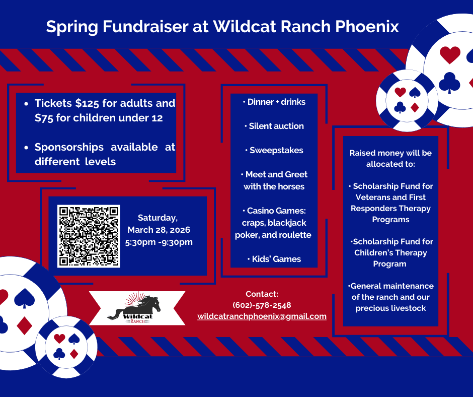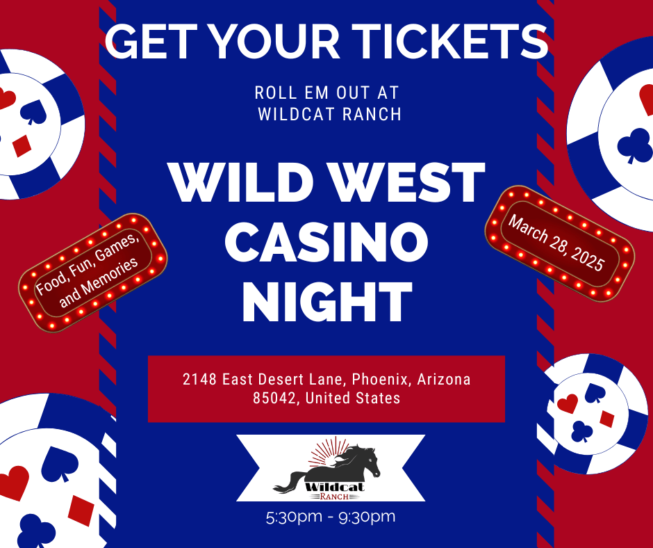 Join us for an unforgettable evening at the Wild West Casino Night 2026, hosted by Wildcat Ranch Phoenix on March 28th from 5:30 to 9:30 PM at our beautiful venue located at 2148 E Desert Ln, Phoenix, AZ. Step into a lively atmosphere filled with excitement as we transform the ranch into a bustling casino, complete with thrilling games and on line silent auction featuring exclusive items and unique treasures. Guests will have a chance to win fabulous prizes through our sweepstakes, all while enjoying delicious food and drinks. This event promises a night of fun and philanthropy, as all proceeds will support our mission to provide a provide accessible and effective equine-assisted therapy, promote excellence in horsemanship, and offer educational programs that empower individuals of all ages. Grab your hat and/or dress up in your favorite western outfit. Don’t miss out on this chance to make a difference while having a blast—mark your calendars and get ready to roll the dice for a great cause!